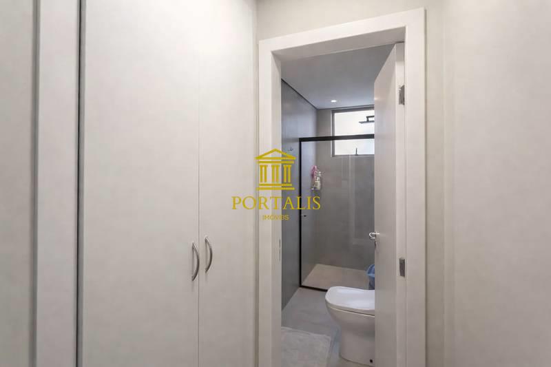 Banheiros (social e suíte) com box em blindex, armários e espelhos.