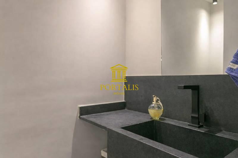 Sala para 02 ambientes, com piso em porcelanato, teto em gesso, projeto de iluminação da A de Arte, ar-condicionado, adega e varanda integrada.