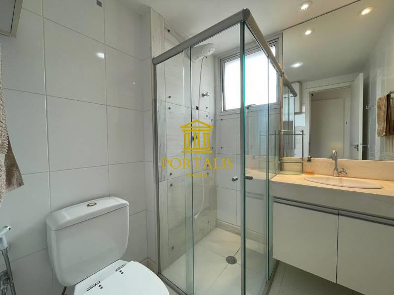 Banheiros (social e suíte) com excelente acabamento, armários, espelhos e box em blindex.